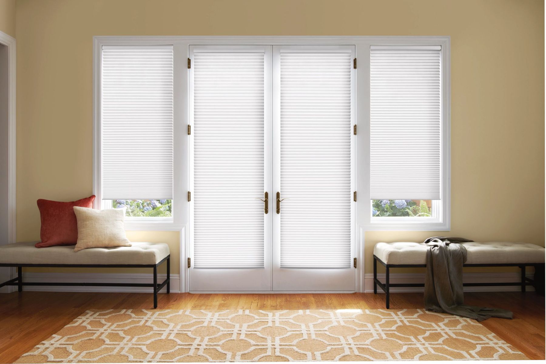 Covering garden doors with blinds can be challenging due to their size, the need for functionality, and potential for damage. When selecting a blind or shade, slim headrails and hold-down brackets are often chosen for garden door shades because they offer a sleek, streamlined look and prevent the shades from moving or making noise when the door is opened or closed.