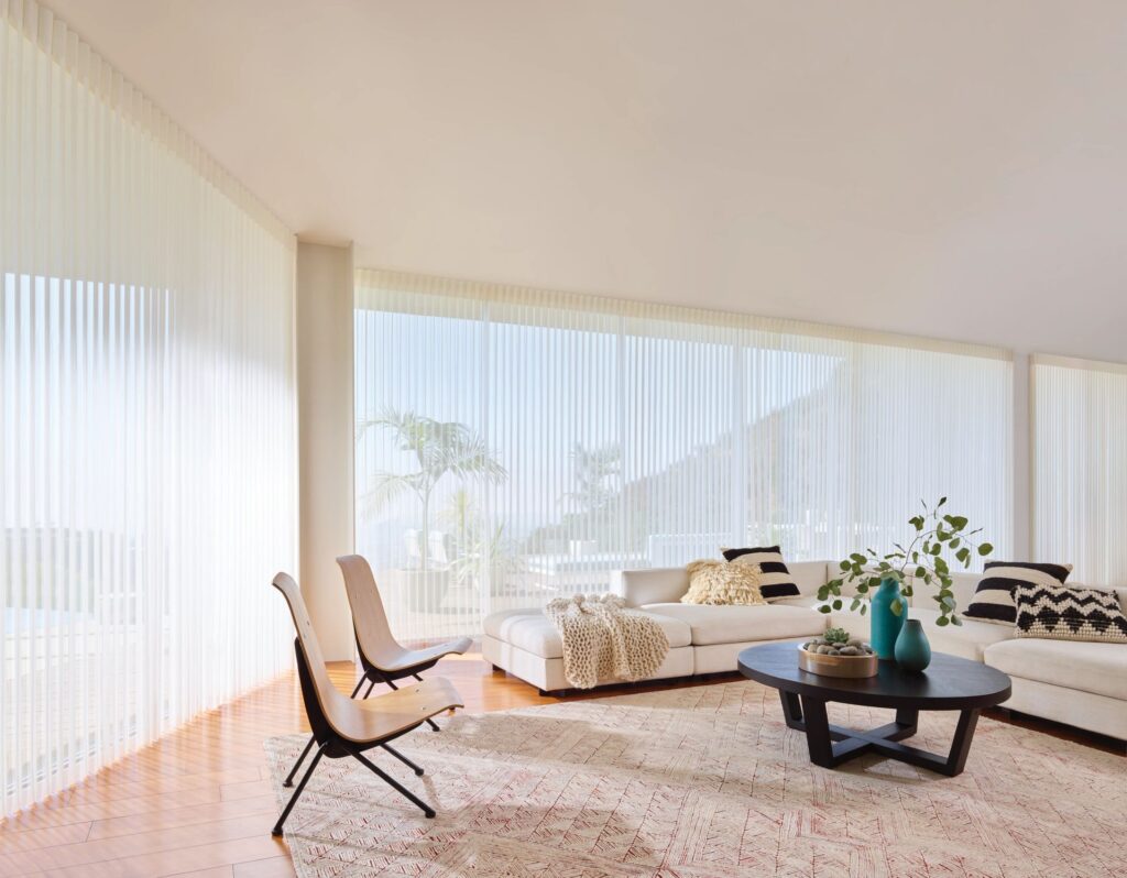 Hunter Douglas Luminette Privacy Sheers marry the beauty of sheers with the privacy of soft draperies. Available in a side or split stack design, these vertical sheer window treatments are especially suited for larger, rectangular windows and sliding glass doors.