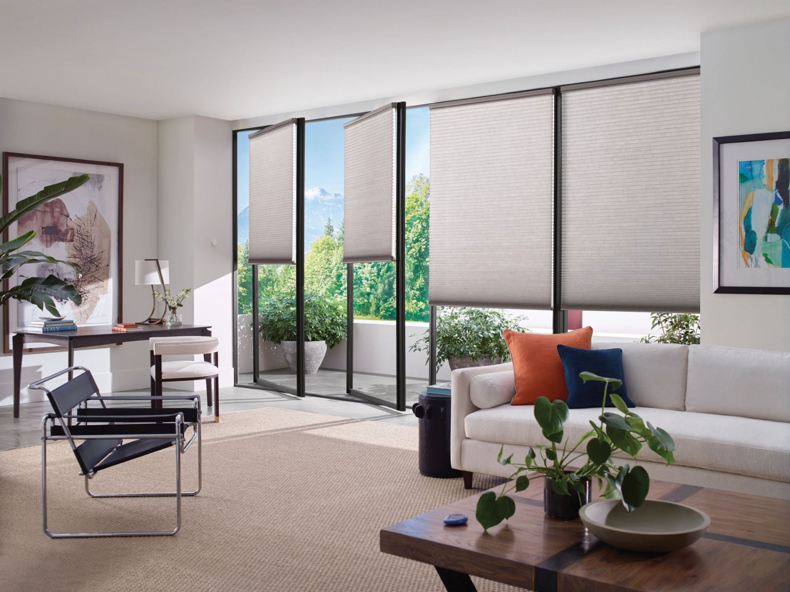 Meet TrackGlide. Sleek tracks run along the edges of the window frame, allowing window shades to operate no matter the position of the window. Available exclusively with Duette honeycomb shades, you can enjoy light control, reduced glare, and privacy. You’ll also have the option to choose top down bottom up in addition to the comfort of these insulated shades.