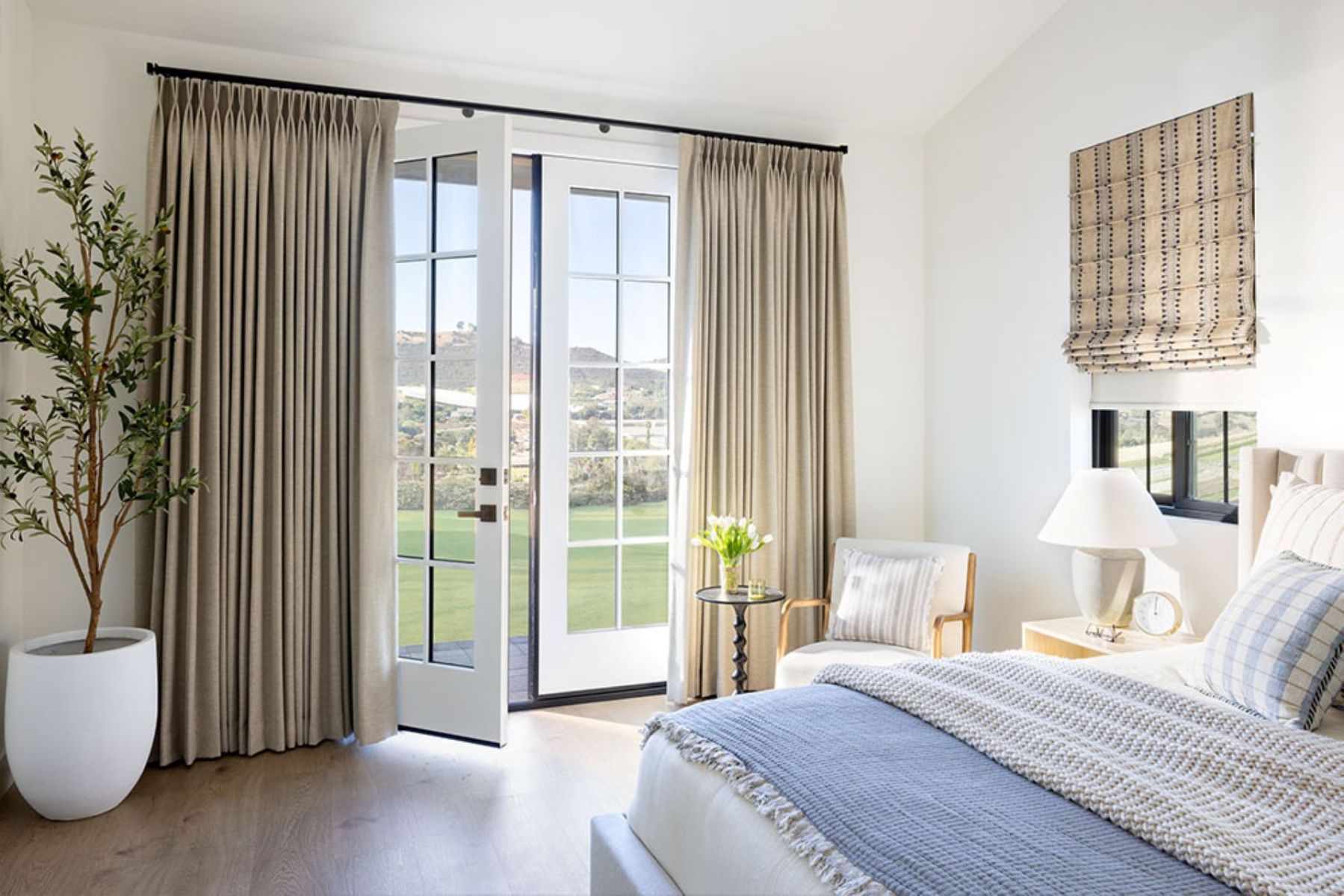 Traversing draperies, using traverse rods, are loved for their smooth and effortless operation, especially when opening and closing large or heavy curtains. The track system allows curtains to glide easily across the window, eliminating the need for manual pulling and reducing wear on the fabric. They are also favored for their ability to distribute weight evenly, preventing sagging, and for their aesthetic appeal, especially with luxurious window coverings.