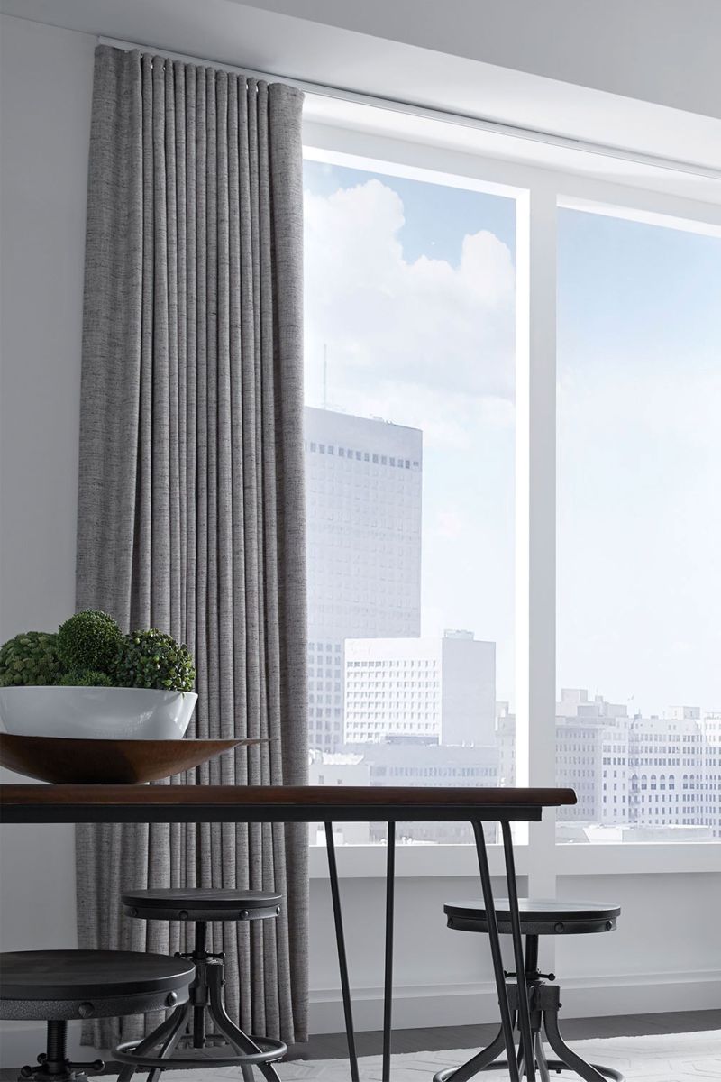 Traversing draperies, using traverse rods, are loved for their smooth and effortless operation, especially when opening and closing large or heavy curtains. The track system allows curtains to glide easily across the window, eliminating the need for manual pulling and reducing wear on the fabric. They are also favored for their ability to distribute weight evenly, preventing sagging, and for their aesthetic appeal, especially with luxurious window coverings.